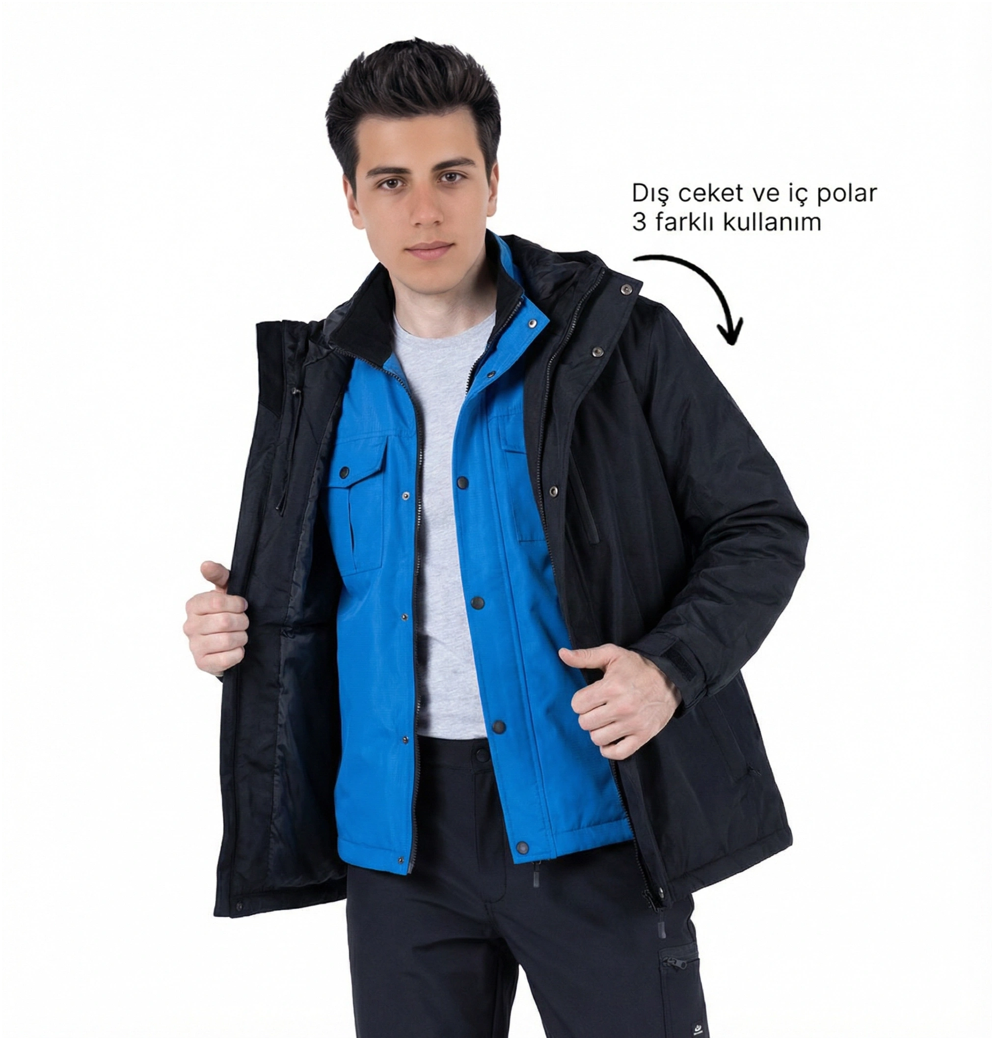 • Kapüşonu lastik stoper ile ayarlanabilir, yaka içine gizlenebilir, ön kısmı cırt kapamalıdır ve arka kısmı cırt mandal detaylıdır.